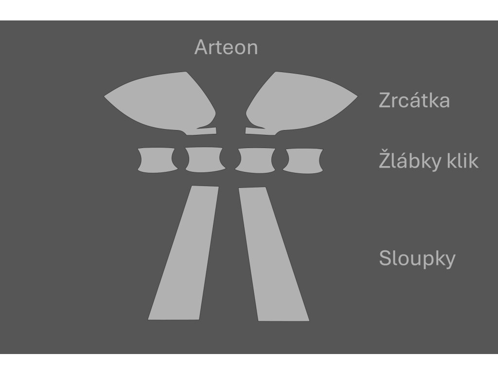 JEM PPF předřezaná fólie zrcátka, žlábky klik a sloupky VW Arteon Černý lesk